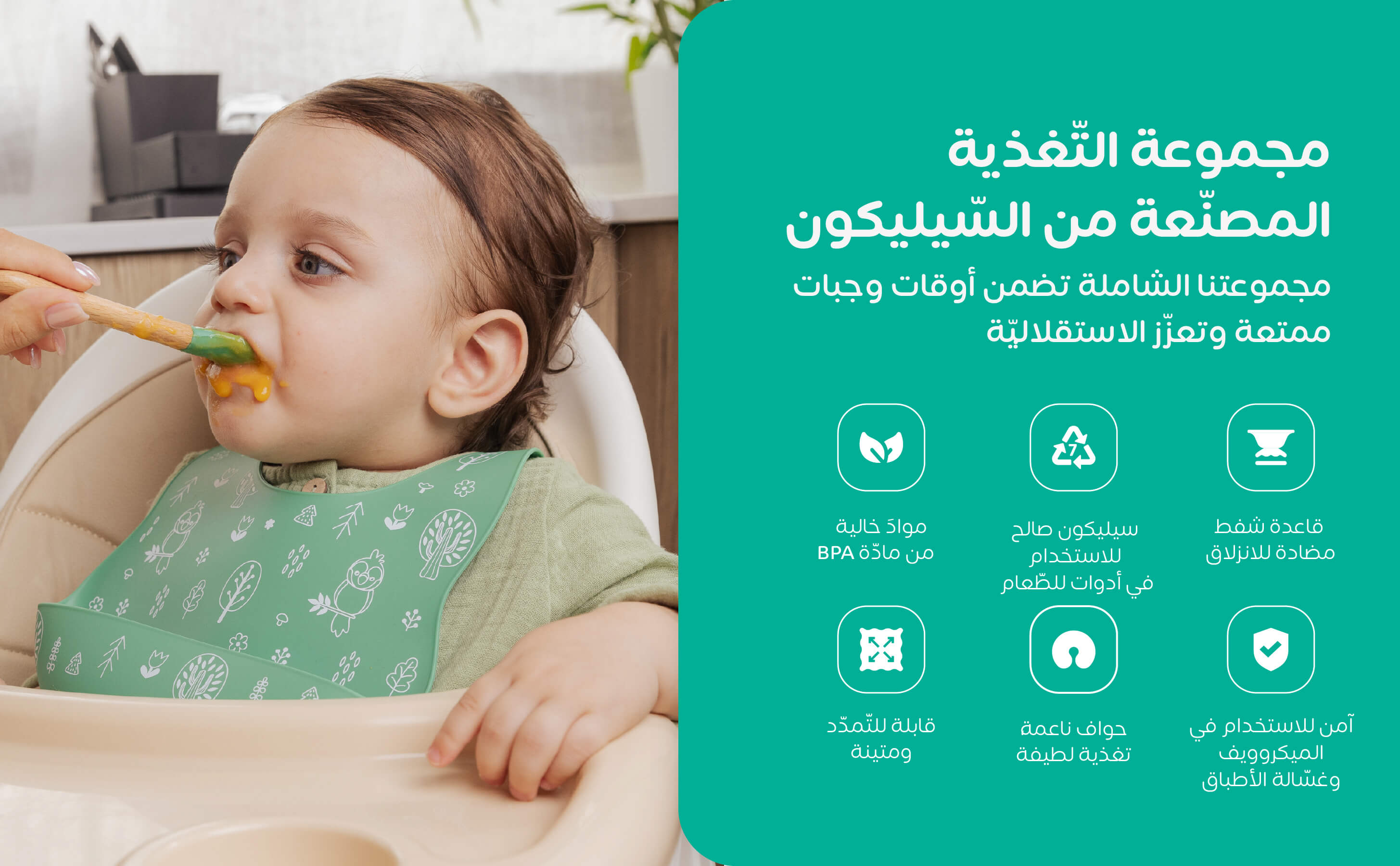 - أبطال التغذية الذاتية: شجعوا التغذية الذاتية مع الملعقة والشوكة السيليكونية الناعمة التي تكون لطيفة على اللثة وسهلة الإمساك للأيدي الصغيرة.